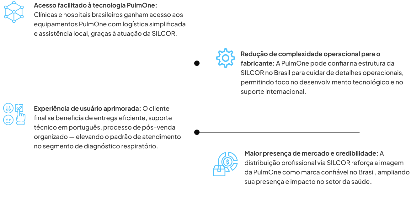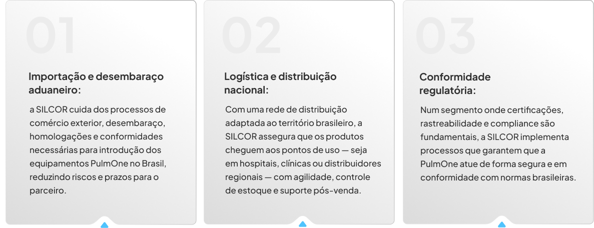 A SILCOR assume o papel de importadora-distribuidora, garantindo que os produtos da PulmOne sejam disponibilizados de forma confiável, rastreável e em conformidade com todas as exigências locais.