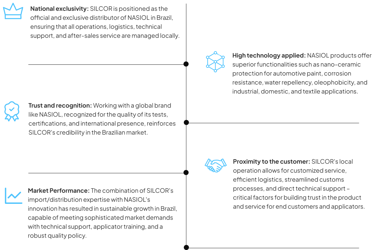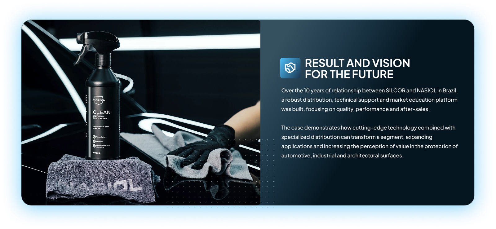 For more than a decade, SILCORTRADING has operated as the exclusive importer and distributor of NASIOL in Brazil, continuously expanding the brand’s reach and raising quality standards in the nanotechnology segment applied to surface protection.